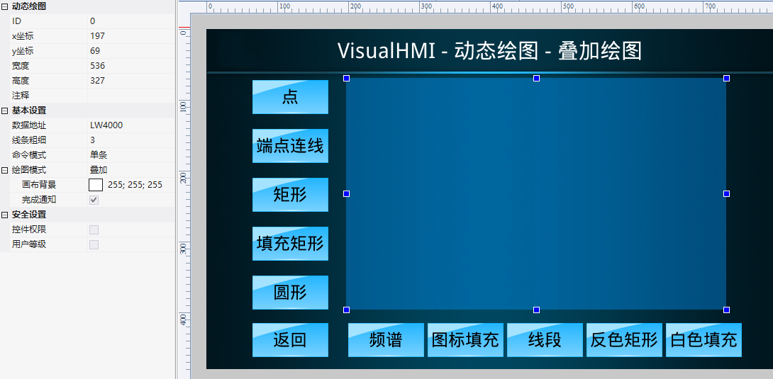 画面中添加第一个动态绘图控件,地址为0x4000,线条粗细为3,命令模式为“单条”,绘图模式为“叠加”,画布背景设置为白色,如下所示