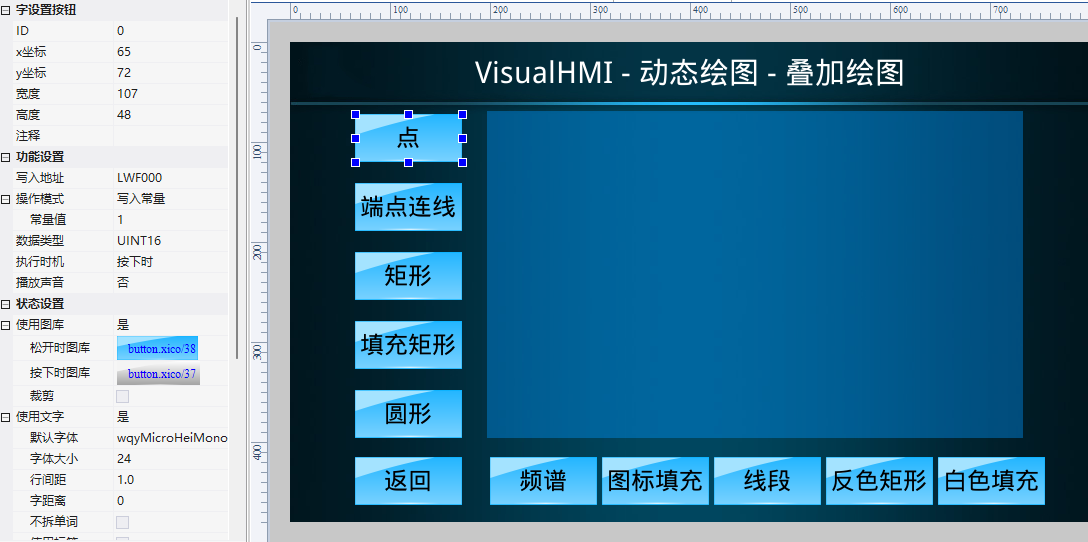画面中添加9个字设置按钮,地址为0xF000,设置常量依次0~10(不包含8)。用于点击设置动态绘图控件,显示不同的图形,如下所示