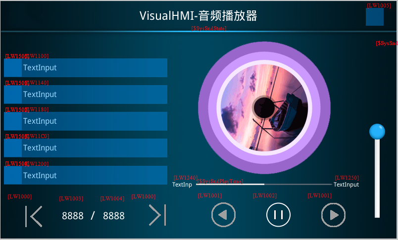 | 播放进度条 | LW0143 →系统变量 | 歌曲播放的当前时间 LW1005=0隐藏 |