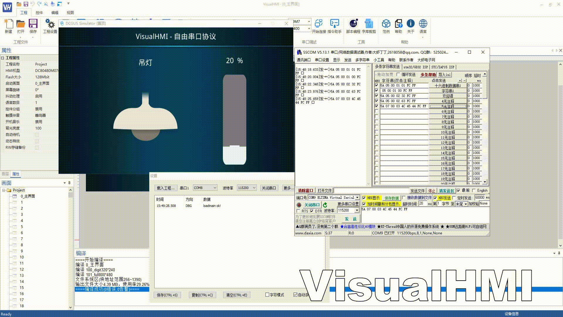 本例程通过控制 LED 灯的开关状态、亮度调节和设备名称修改,演示如何在 VisualHMI 中使用 LUA 脚本实现自定义串口协议通信。系统与外设(如单片机控制的智能灯模块)通过主串口或副串口进行双向交互。