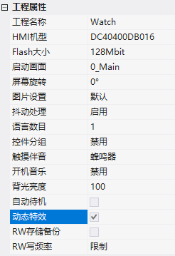 在VisualHMI工程属性中,勾选动态特效,才能够启用功能,如下所示