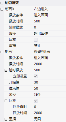 - 动画:动画0设置“右边进入”,动画1设置“设置Y坐标”;