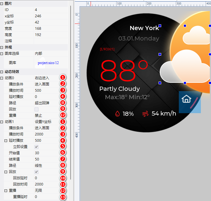 工程启用动态特效后,动画的设置,属性配置如下所示: