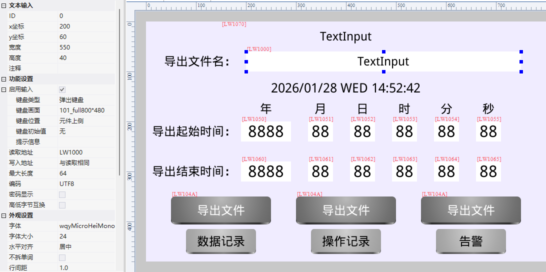 HMI 系统中的记录类控件(如数据记录、操作记录和告警)支持灵活的数据导出功能,用户可精确指定导出数据的时间范围,包括起始时间与结束时间,确保仅导出所需时段内的有效记录。同时,系统允许自定义导出文件的名称,便于按项目、设备或日期进行分类管理。