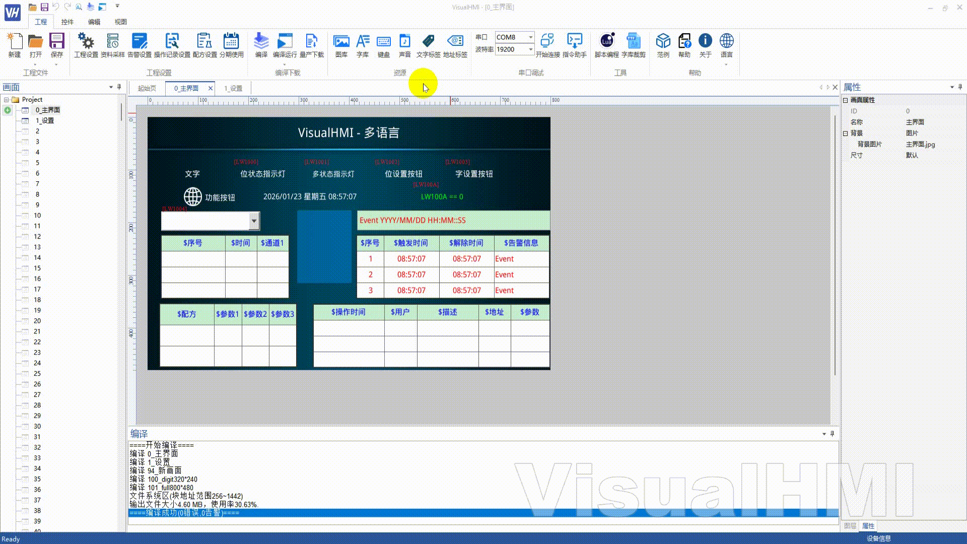 VisulHMI平台支持多语言功能,用户不需要配置多套UI,将UI上的文字去掉,用相关控件代替代UI上的文字,配置控件上的相关语言词条,通过设置系统寄存器-多语言寄存器,一键切换不同语言词条