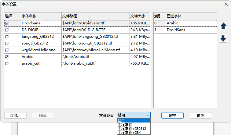 - 勾选字库,如新添加的Arabic.ttf,索引为1,其中新添加的字库,会在工程目录下新建font文件夹,并将Arabic.ttf放在..\font目录下